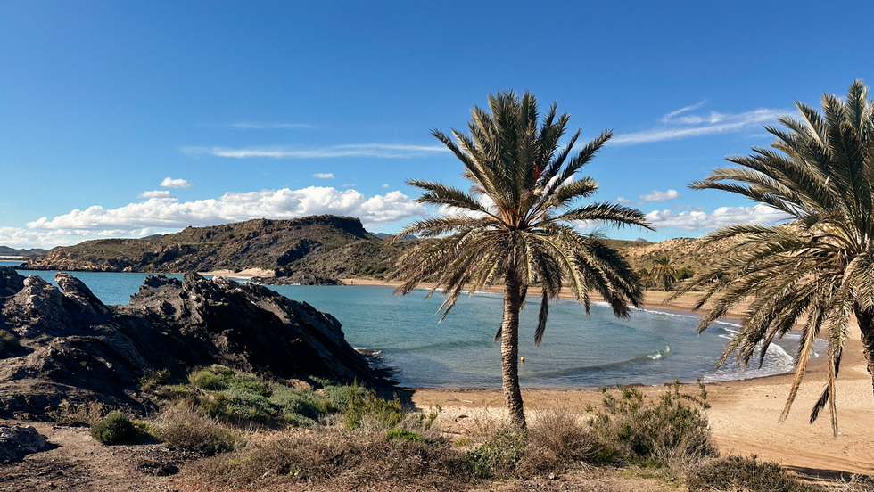 On one side, the shapes of Sierra de las Moreras. On the other, the sea — close enough to keep stealing your attention. In between: a semi-arid landscape that feels almost desert-like. Dry ground, sparse vegetation, sun pressing down gently but persistently.